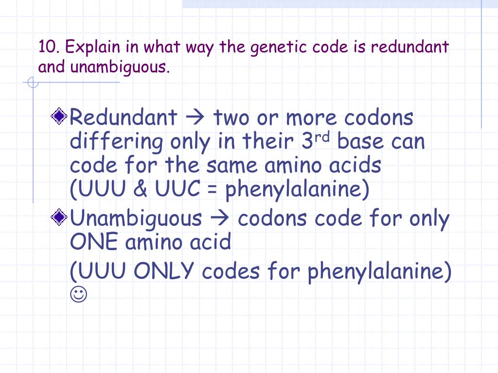 10. Explain in what way the genetic code is redundant and unambiguous. • Redundant two or more codons differing only in their 3rd base can code for the same amino acids (UUU & UUC = phenylalanine) • Unambiguous codons code for only ONE amino acid (UUU ONLY codes for phenylalanine)