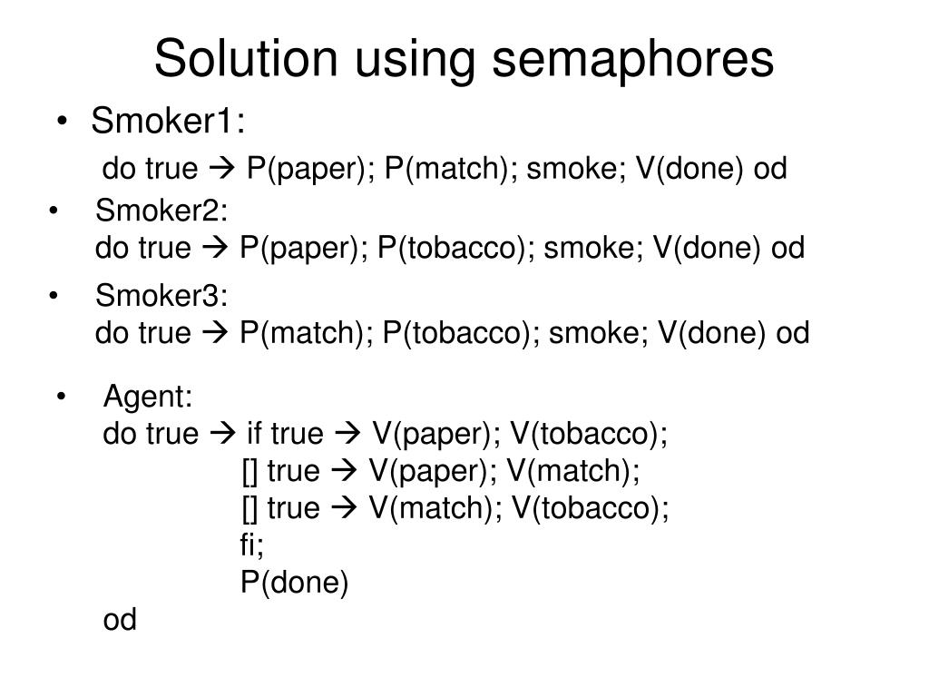 Solution using semaphores • Smoker1: do true < await (inp > outp /\ inm > outm) outp = outp + 1; outm = outm + 1 > smoke <done = true> od • Agent: do true < await( done) done = false; if true inp = inp + 1; inm = inm + 1 [] true inp = inp + 1; int= int+ 1 [] true int= int+ 1; inm = inm + 1 fi >