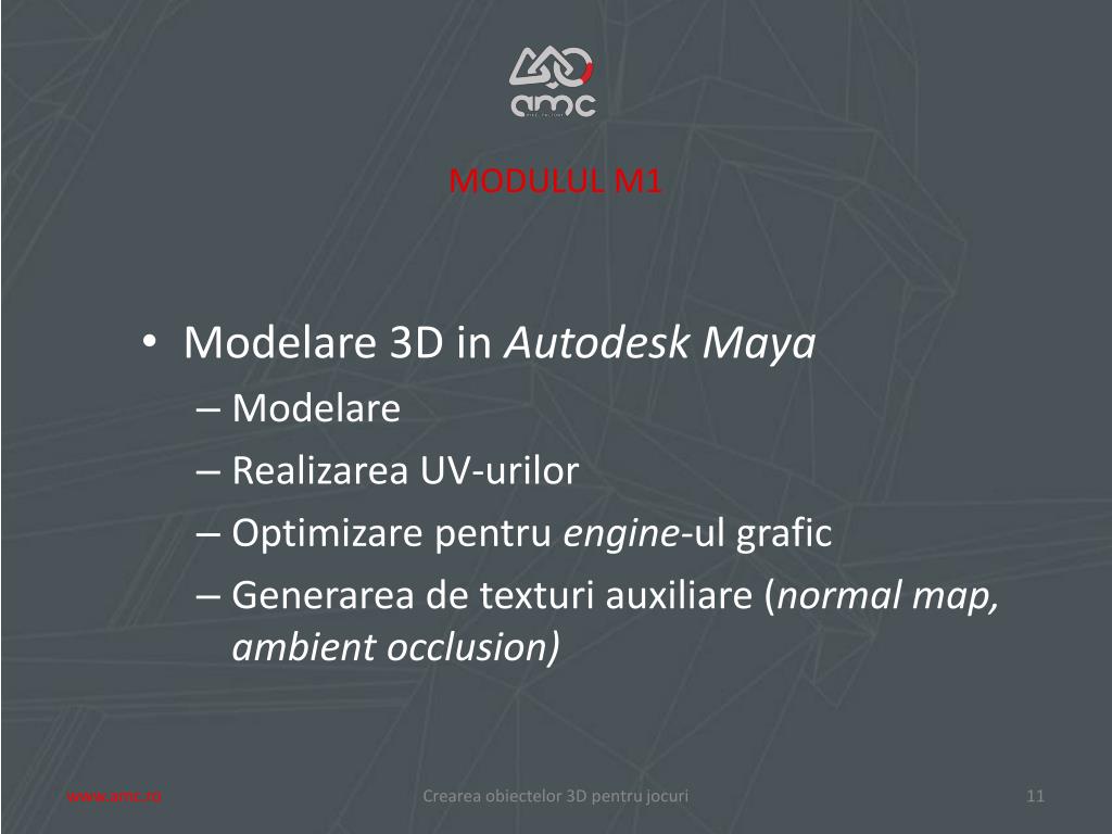 MODULUL M1 • Modelare 3D in Autodesk Maya • Modelare • Realizarea UV-urilor • Optimizarepentruengine-ulgrafic • Generarea de texturiauxiliare (normal map, ambient occlusion) Creareaobiectelor 3D pentrujocuri www.amc.ro