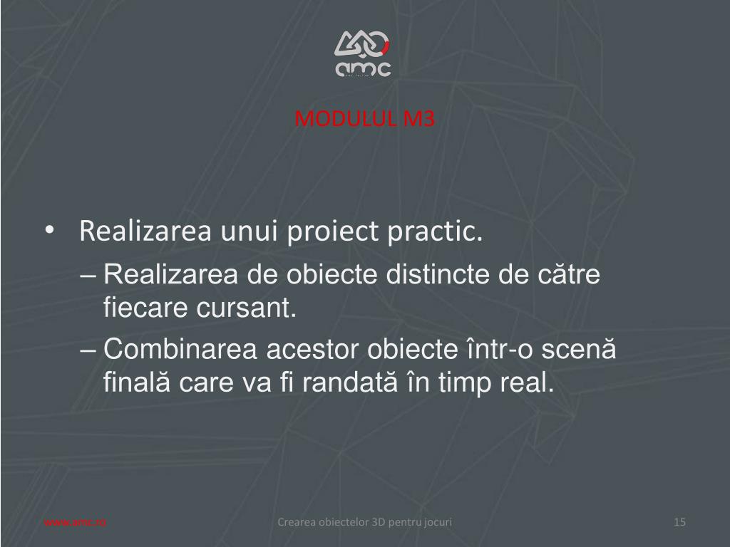 MODULUL M3 • Realizareaunuiproiectpractic. • Realizarea de obiecte distincte de către fiecare cursant. • Combinarea acestor obiecte într-o scenă finală care va fi randatăîn timp real. Creareaobiectelor 3D pentrujocuri www.amc.ro