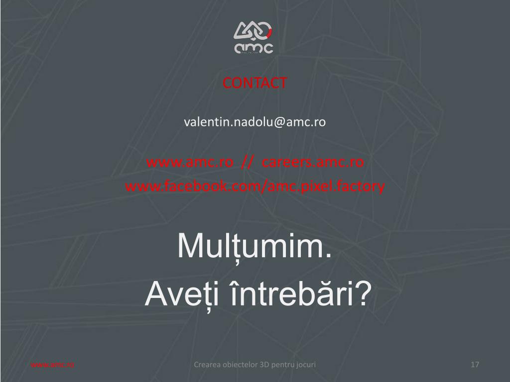 CONTACT valentin.nadolu@amc.ro www.amc.ro // careers.amc.ro www.facebook.com/amc.pixel.factory Mulțumim. Aveți întrebări? Crearea obiectelor 3D pentru jocuri www.amc.ro