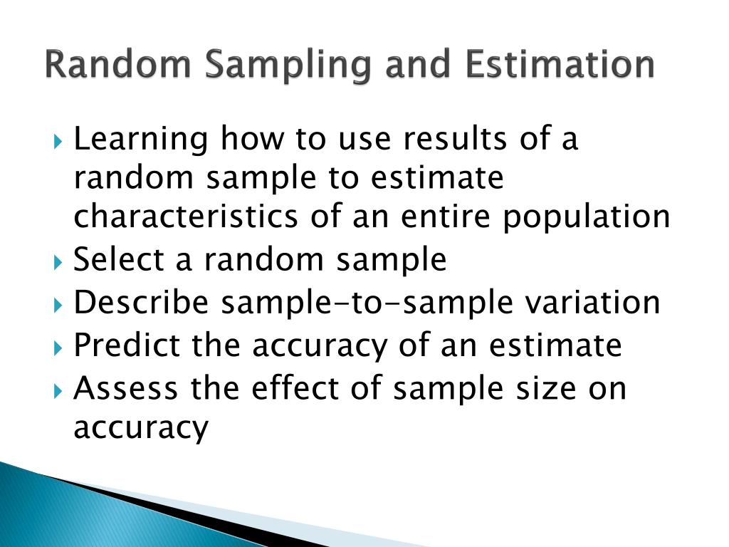 Random Sampling and Estimation • Learning how to use results of a random sample to estimate characteristics of an entire population • Select a random sample • Describe sample-to-sample variation • Predict the accuracy of an estimate • Assess the effect of sample size on accuracy