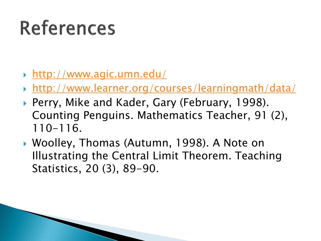 References • http://www.agic.umn.edu/ • http://www.learner.org/courses/learningmath/data/ • Perry, Mike and Kader, Gary (February, 1998). Counting Penguins. Mathematics Teacher, 91 (2), 110-116. • Woolley, Thomas (Autumn, 1998). A Note on Illustrating the Central Limit Theorem. Teaching Statistics, 20 (3), 89-90.