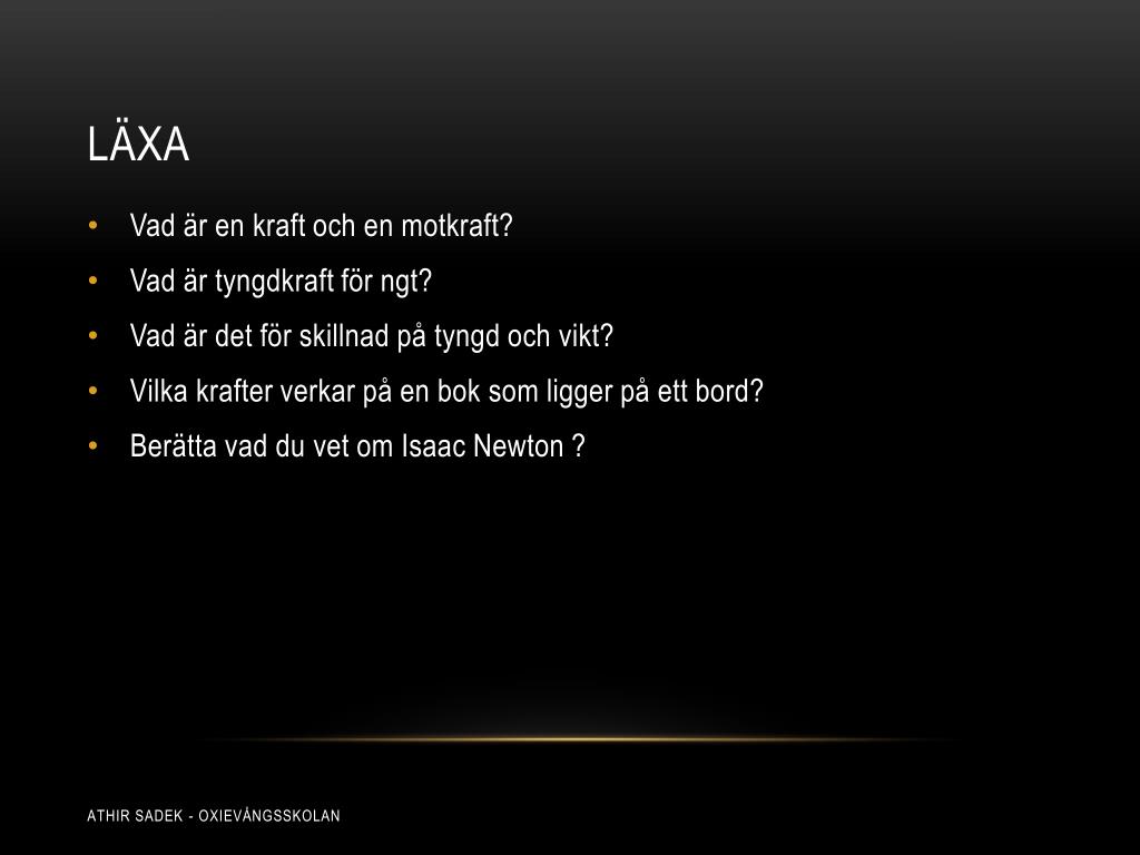 läxa • Vad är en kraft och en motkraft? • Vad är tyngdkraft för ngt? • Vad är det för skillnad på tyngd och vikt? • Vilka krafter verkar på en bok som ligger på ett bord? • Berätta vad du vet om Isaac Newton ? Athir Sadek - Oxievångsskolan