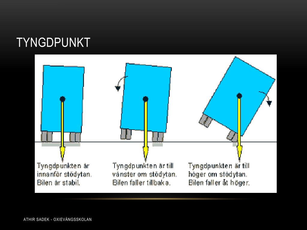 tyngdpunkt • Alla föremål har entyngdpunkt. Tyngdpunkten ligger mitt i koppen eller föremålet. • För att ett föremål ska stå stadigt måste tyngdpunkten finnas rakt över stödytan. • En stor stödyta ger bättre stabilitet än en liten. Athir Sadek - Oxievångsskolan