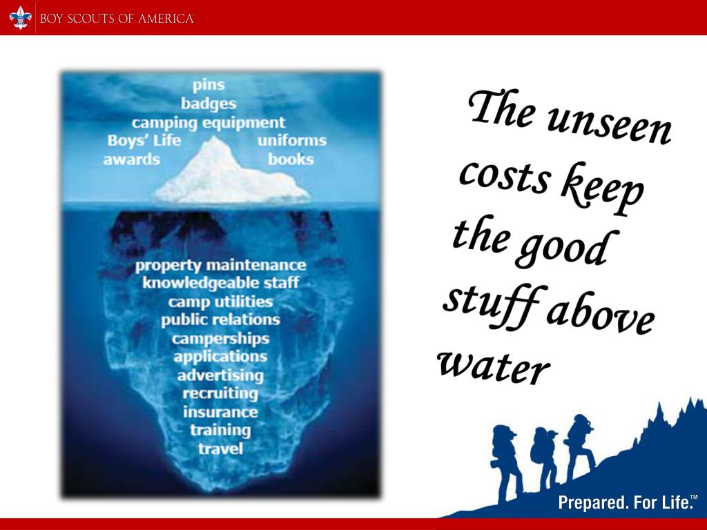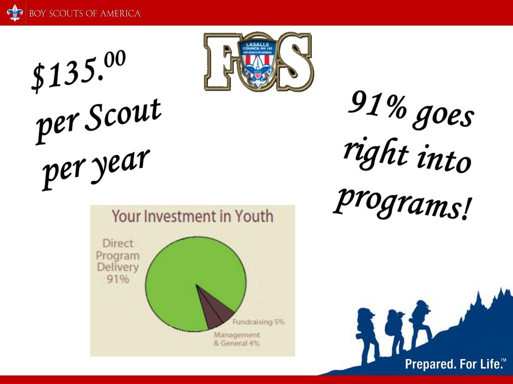 LaSalle Council. Friends of Scouting 2013. How much does this cost?. The unseen costs keep the good stuff above water. $135. 00 per Scout per year. 91% goes right into programs!. Make an Investment! Support Your Scout $135 Century Plus $185 Support two Scouts $270 Leadership $350