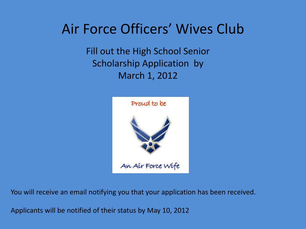 Air Force Officers’ Wives Club Fill out the High School Senior Scholarship Application by March 1, 2012 You will receive an email notifying you that your application has been received. Applicants will be notified of their status by May 10, 2012