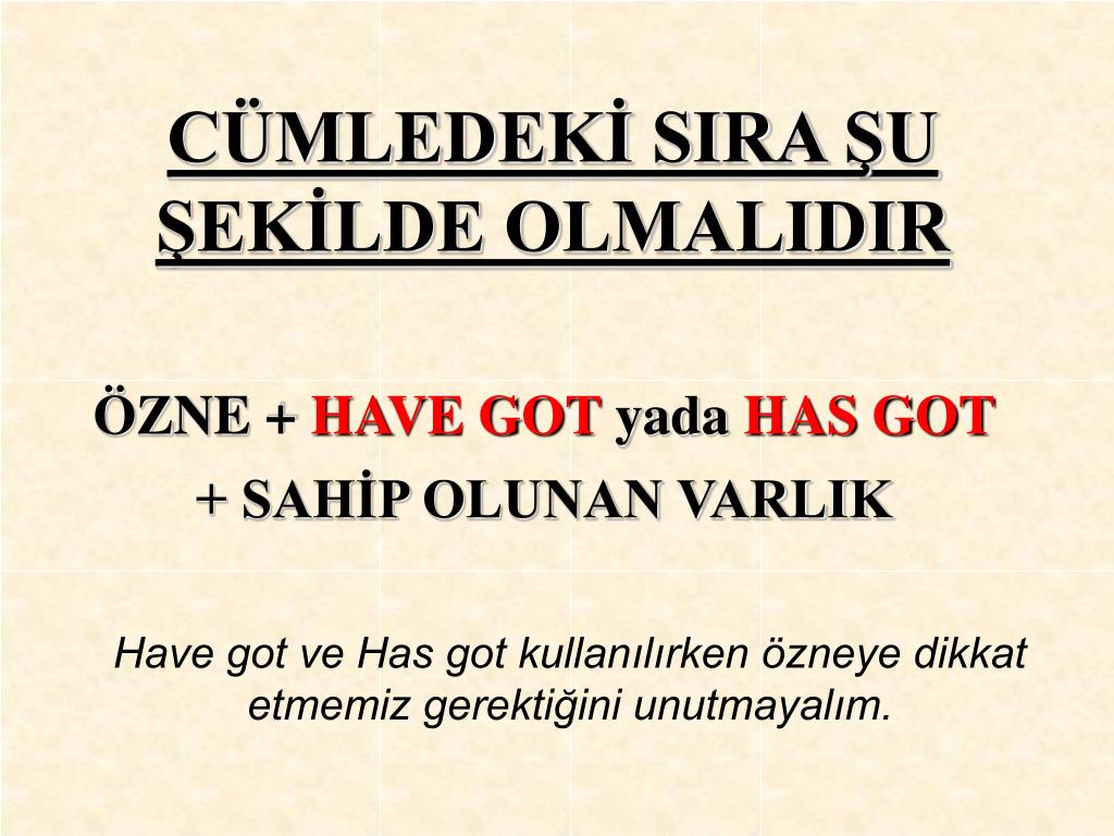 CÜMLEDEKİ SIRA ŞU ŞEKİLDE OLMALIDIR ÖZNE + HAVE GOT yada HAS GOT + SAHİP OLUNAN VARLIK Have got ve Has got kullanılırken özneye dikkat etmemiz gerektiğini unutmayalım.
