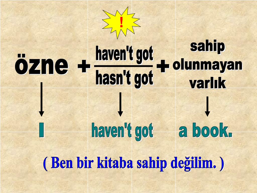 ! sahip olunmayan varlık haven't got özne + + hasn't got I haven't got a book. ( Ben bir kitaba sahip değilim. )