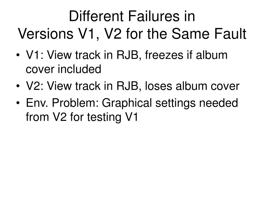 Different Failures in Versions V1, V2 for the Same Fault • V1: View track in RJB, freezes if album cover included • V2: View track in RJB, loses album cover • Env. Problem: Graphical settings needed from V2 for testing V1