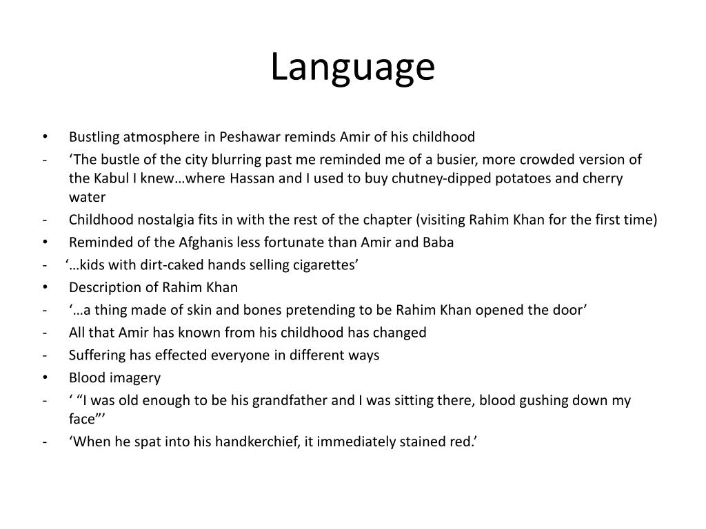 Language • Bustling atmosphere in Peshawar reminds Amir of his childhood • ‘The bustle of the city blurring past me reminded me of a busier, more crowded version of the Kabul I knew…where Hassan and I used to buy chutney-dipped potatoes and cherry water • Childhood nostalgia fits in with the rest of the chapter (visiting Rahim Khan for the first time) • Reminded of the Afghanis less fortunate than Amir and Baba - ‘…kids with dirt-caked hands selling cigarettes’ • Description of Rahim Khan • ‘…a thing made of skin and bones pretending to be Rahim Khan opened the door’ • All that Amir has known from his childhood has changed • Suffering has effected everyone in different ways • Blood imagery • ‘ “I was old enough to be his grandfather and I was sitting there, blood gushing down my face”’ • ‘When he spat into his handkerchief, it immediately stained red.’