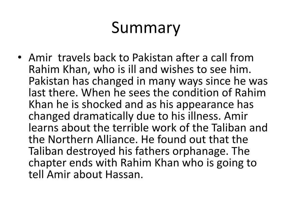 Summary • Amir travels back to Pakistan after a call from Rahim Khan, who is ill and wishes to see him. Pakistan has changed in many ways since he was last there. When he sees the condition of Rahim Khan he is shocked and as his appearance has changed dramatically due to his illness. Amir learns about the terrible work of the Taliban and the Northern Alliance. He found out that the Taliban destroyed his fathers orphanage. The chapter ends with Rahim Khan who is going to tell Amir aboutHassan.