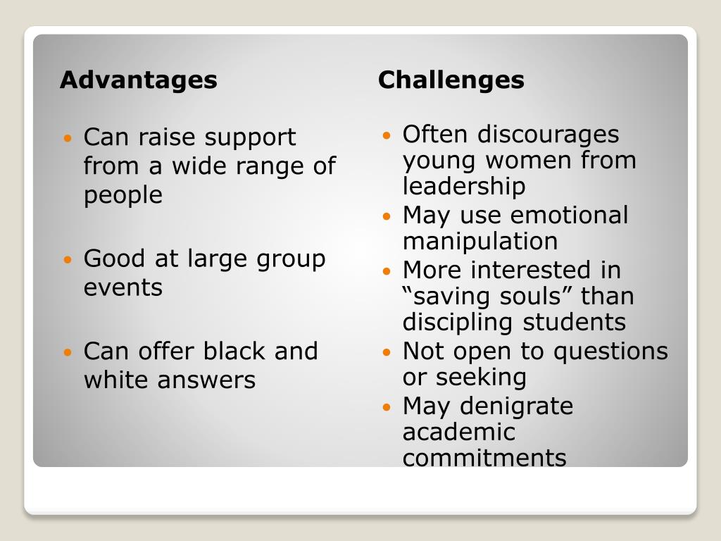 Advantages Challenges • Can raise support from a wide range of people • Good at large group events • Can offer black and white answers • Often discourages young women from leadership • May use emotional manipulation • More interested in “saving souls” than discipling students • Not open to questions or seeking • May denigrate academic commitments