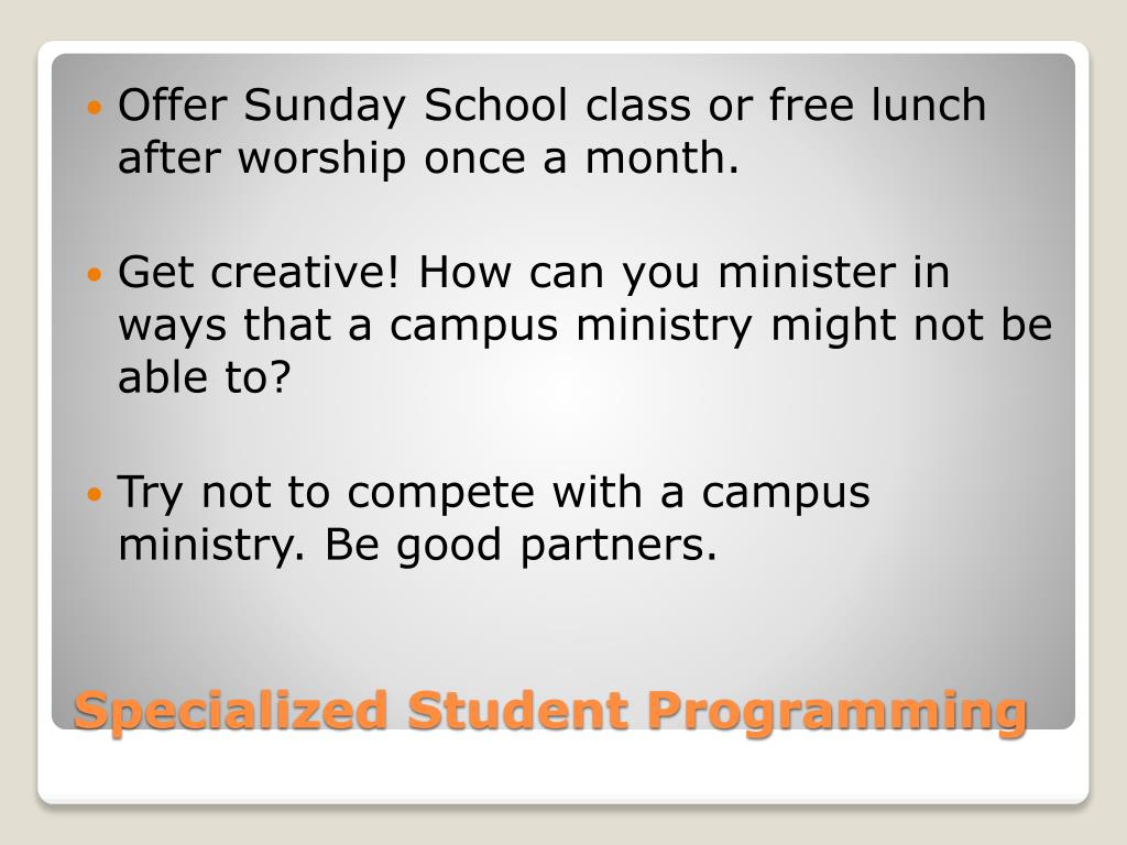 Offer Sunday School class or free lunch after worship once a month. • Get creative! How can you minister in ways that a campus ministry might not be able to? • Try not to compete with a campus ministry. Be good partners. Specialized Student Programming