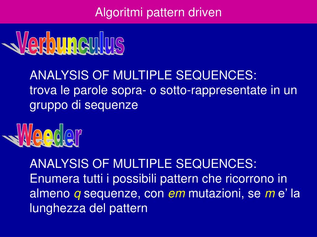 Algoritmi pattern driven Verbunculus ANALYSIS OF MULTIPLE SEQUENCES: trova le parole sopra- o sotto-rappresentate in un gruppo di sequenze ANALYSIS OF MULTIPLE SEQUENCES: Enumera tutti i possibili pattern che ricorrono in almeno q sequenze, con emmutazioni, se m e’ la lunghezza del pattern Weeder