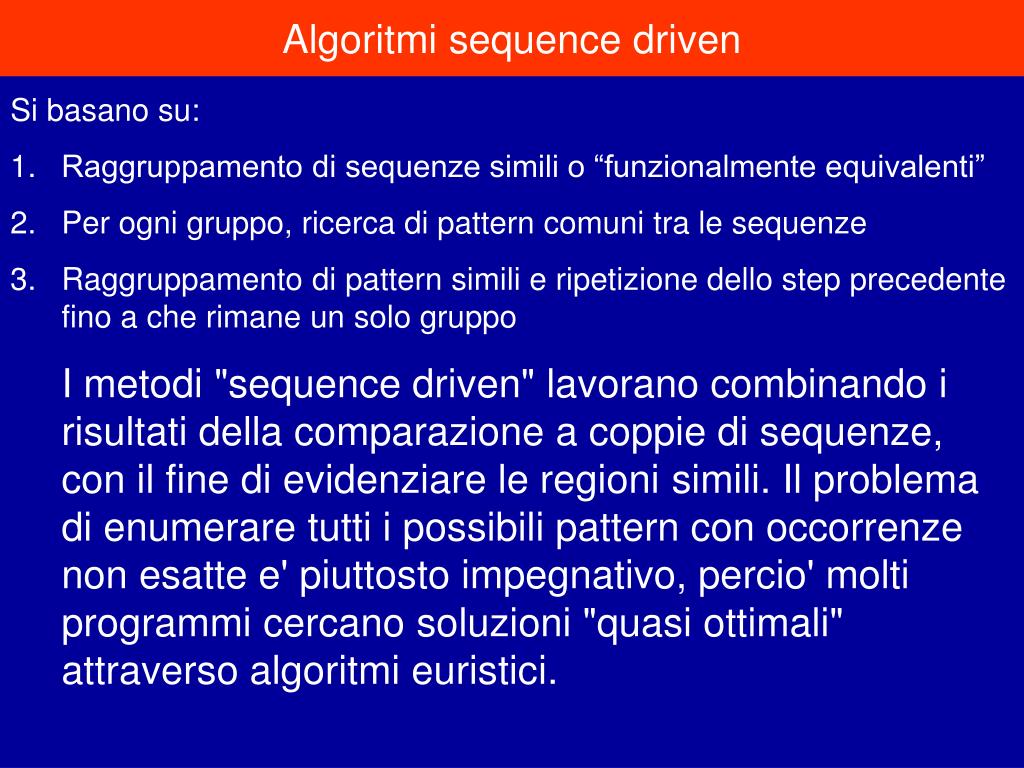 Algoritmi sequence driven • Si basano su: • Raggruppamento di sequenze simili o “funzionalmente equivalenti” • Per ogni gruppo, ricerca di pattern comuni tra le sequenze • Raggruppamento di pattern simili e ripetizione dello step precedente fino a che rimane un solo gruppo • I metodi "sequence driven" lavorano combinando i risultati della comparazione a coppie di sequenze, con il fine di evidenziare le regionisimili. Il problema di enumerare tutti i possibili pattern con occorrenze non esatte e' piuttosto impegnativo, percio' molti programmi cercanosoluzioni "quasi ottimali" attraverso algoritmi euristici.