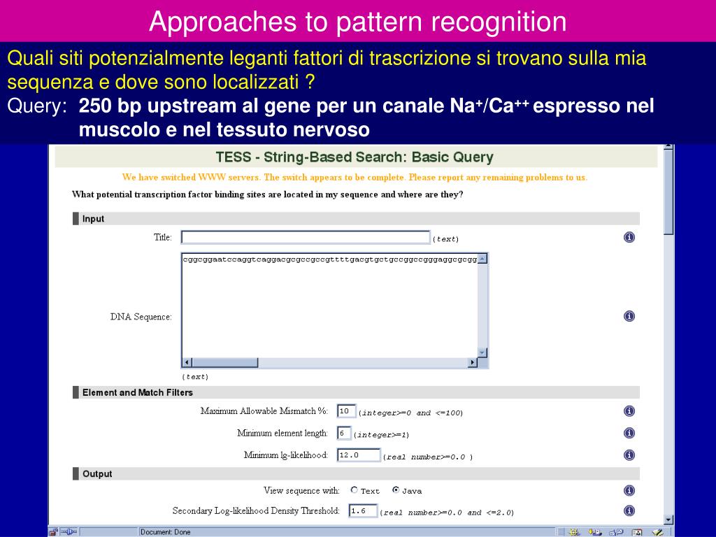 Quali siti potenzialmente leganti fattori di trascrizione si trovano sulla mia sequenza e dove sono localizzati ?Query: 250 bp upstream al gene per un canale Na+/Ca++ espresso nel muscolo e nel tessuto nervoso Approaches to pattern recognition