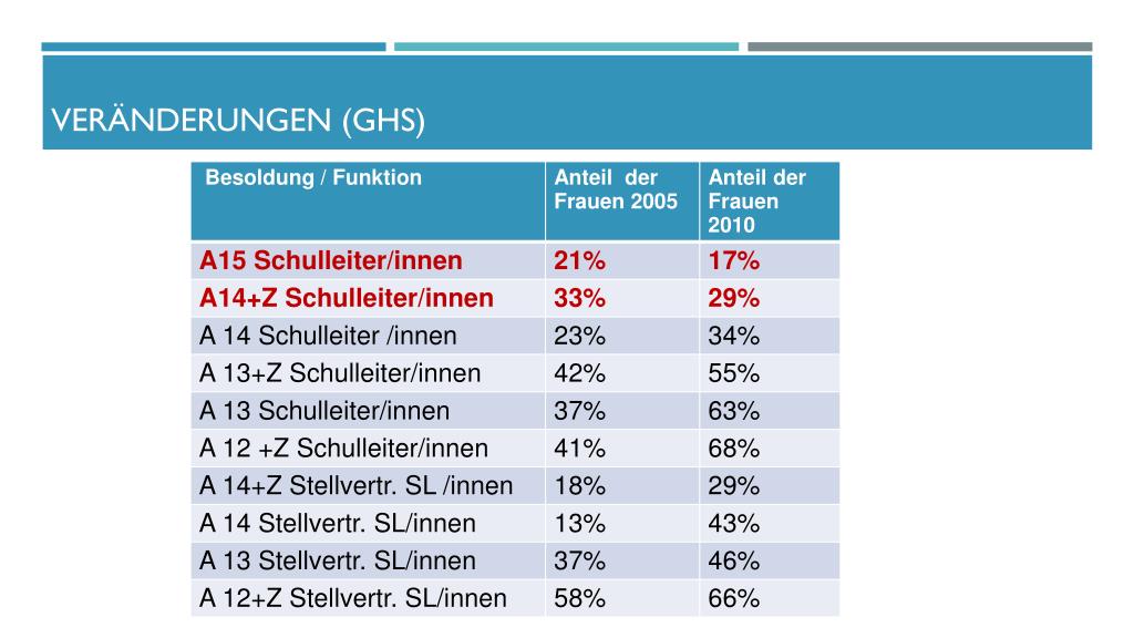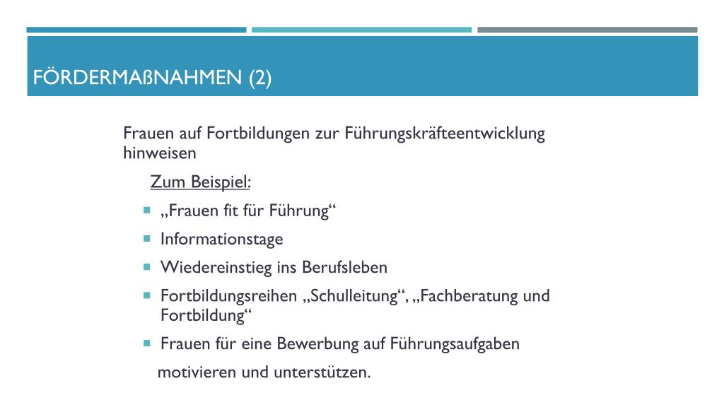 Fördermaßnahmen (1) • Die Schulleitung hat die Aufgabe, Lehrerinnen gezielt zu fördern. Das bedeutet, Lehrerinnen Aufgaben zu übertragen, in denen sie Kompetenzen erwerben und Erfahrungen für Führungspositionen sammeln. • Zum Beispiel: • Übertragung von Aufgaben im Rektorat/Konrektorat(z.B. Prüfungsorganisationen) • Mitarbeit bei Planungs- und Schulentwicklungsaufgaben Achtung:Dies darf zu keiner zeitlichen Mehrbelastung führen!