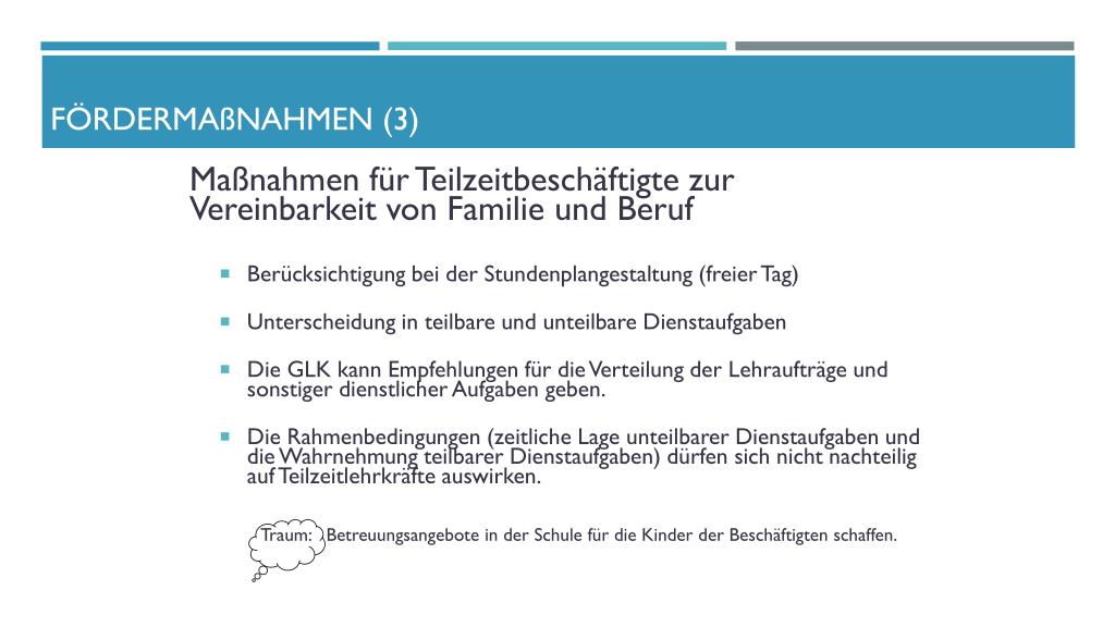 Fördermaßnahmen (3) Maßnahmen für Teilzeitbeschäftigte zurVereinbarkeit von Familie und Beruf • Berücksichtigung bei der Stundenplangestaltung (freier Tag) • Unterscheidung in teilbare und unteilbare Dienstaufgaben • Die GLK kann Empfehlungen für die Verteilung der Lehraufträge und sonstiger dienstlicher Aufgaben geben. • Die Rahmenbedingungen (zeitliche Lage unteilbarer Dienstaufgaben und die Wahrnehmung teilbarer Dienstaufgaben) dürfen sich nicht nachteilig auf Teilzeitlehrkräfte auswirken. Traum: Betreuungsangebote in der Schule für die Kinder der Beschäftigten schaffen.