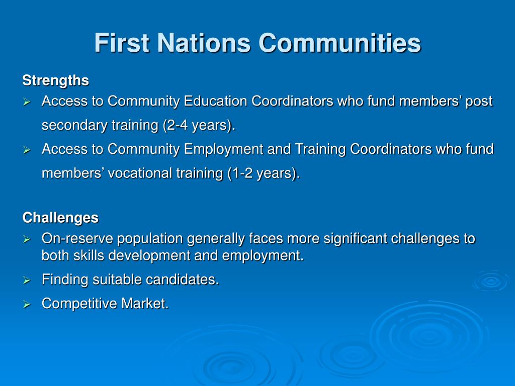 First Nations Communities Strengths • Access to Community Education Coordinators who fund members’ post secondary training (2-4 years). • Access to Community Employment and Training Coordinators who fund members’ vocational training (1-2 years). Challenges • On-reserve population generally faces more significant challenges to both skills development and employment. • Finding suitable candidates. • Competitive Market.