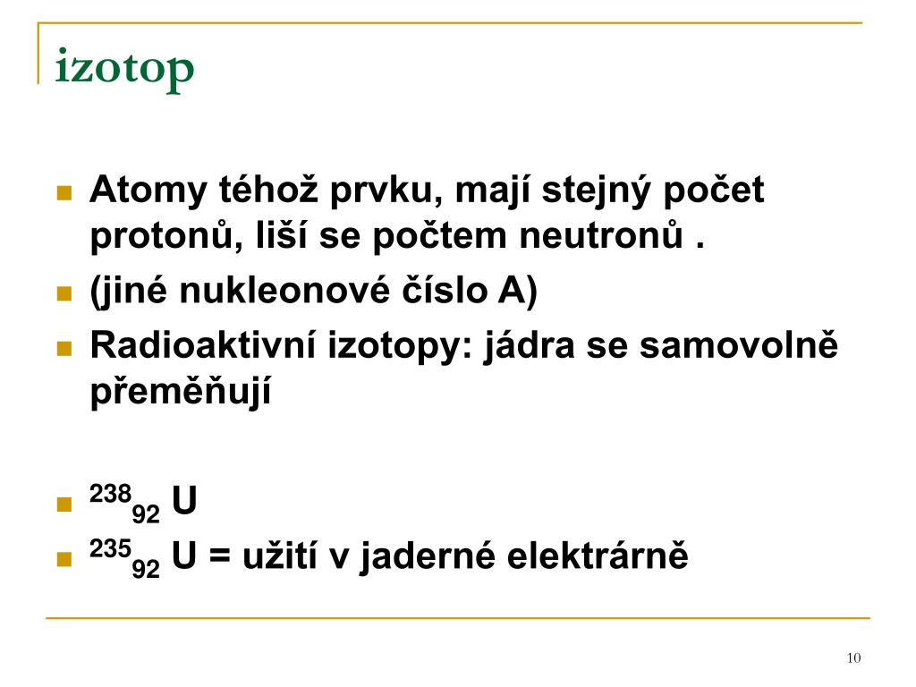 izotop • Atomy téhož prvku, mají stejný počet protonů, liší se počtem neutronů . • (jiné nukleonové číslo A) • Radioaktivní izotopy: jádra se samovolně přeměňují • 23892 U • 23592 U = užití v jaderné elektrárně