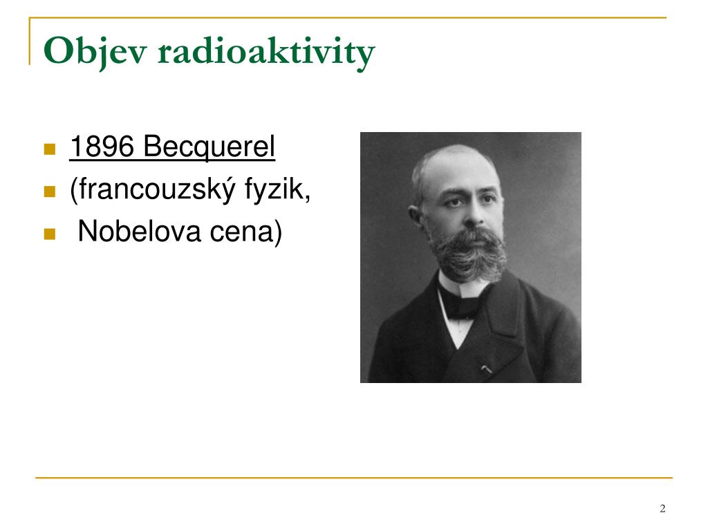 Radioaktivita. Objev radioaktivity. 1896 Becquerel (francouzský fyzik, Nobelova cena). Objev radioaktivity. 1898 manželé Curieovi (Po a radium) (první gram radia izolovala ze smolince pocházejícího z Jáchymova ) 1934 manželé Joliot-Curieovi (umělá radioaktivita)