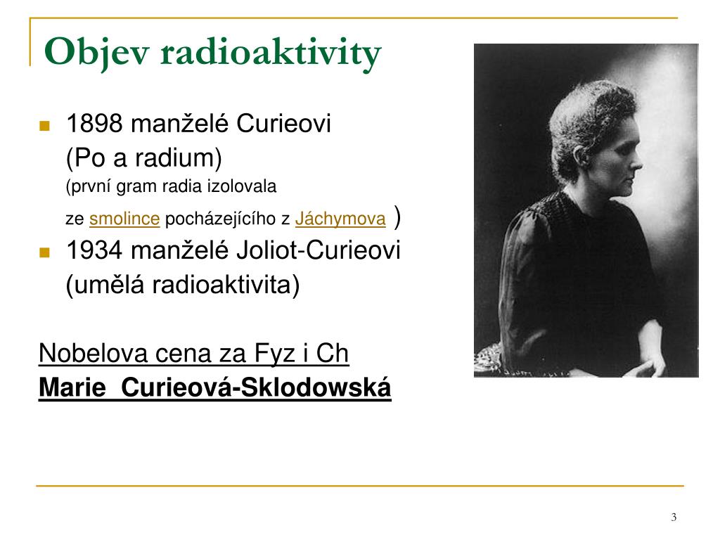 Objev radioaktivity • 1898 manželé Curieovi (Po a radium) (první gram radia izolovala ze smolince pocházejícího z Jáchymova ) • 1934 manželé Joliot-Curieovi (umělá radioaktivita) Nobelova cena za Fyz i Ch Marie Curieová-Sklodowská