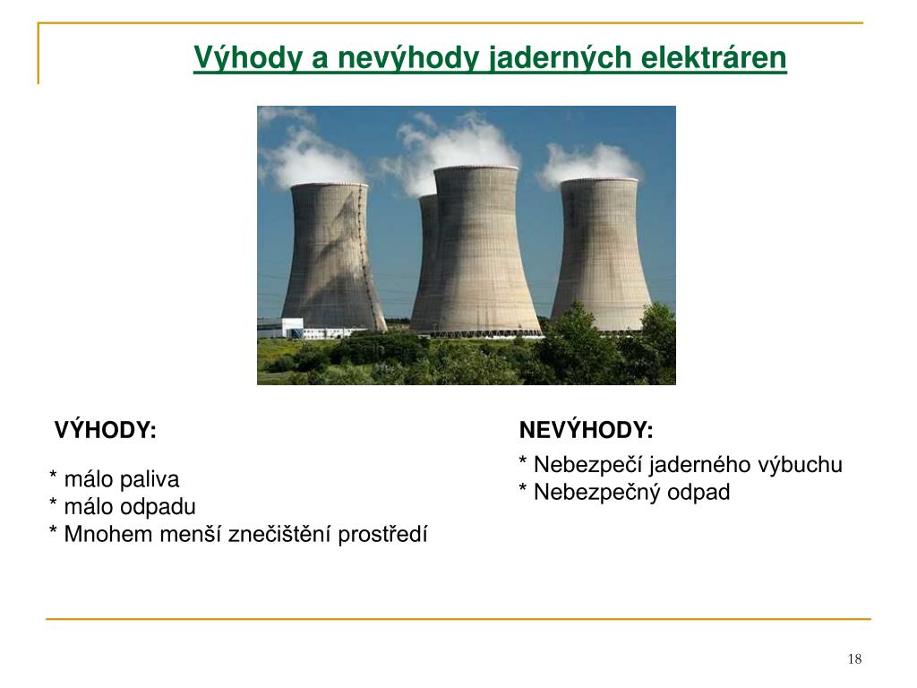 Výhody a nevýhody jaderných elektráren VÝHODY: NEVÝHODY: * Nebezpečí jaderného výbuchu * Nebezpečný odpad * málo paliva * málo odpadu * Mnohem menší znečištění prostředí