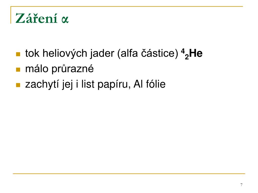 Záření α • tok heliových jader (alfa částice) 42He • málo průrazné • zachytí jej i list papíru, Al fólie