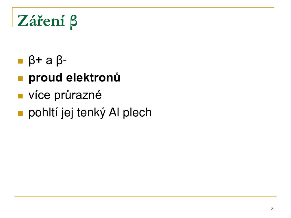 Záření β • β+ a β- • proud elektronů • více průrazné • pohltí jej tenký Al plech