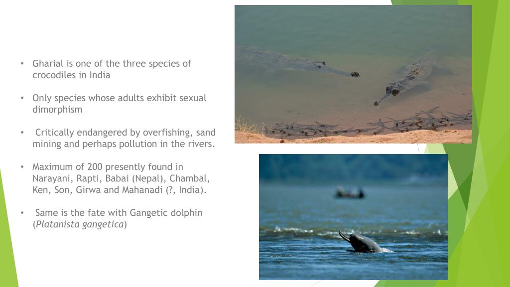 Gharial is one of the three species of crocodiles in India • Only species whose adults exhibit sexual dimorphism • Critically endangered by overfishing, sand mining and perhaps pollution in the rivers. • Maximum of 200 presently found in Narayani, Rapti, Babai (Nepal), Chambal, Ken, Son, Girwa and Mahanadi (?, India). • Same is the fate with Gangetic dolphin (Platanistagangetica)