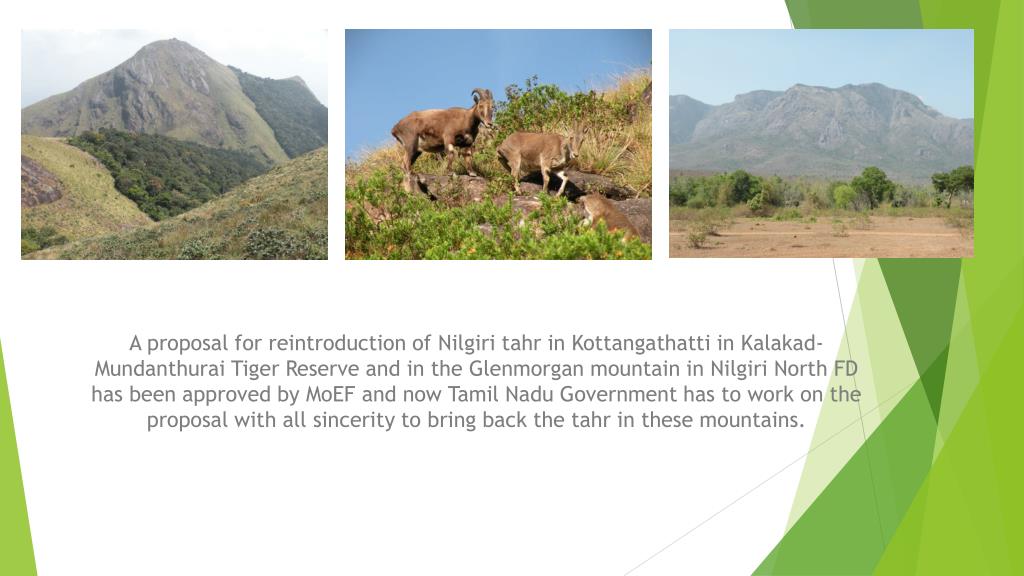 A proposal for reintroduction of Nilgiritahr in Kottangathatti in Kalakad-Mundanthurai Tiger Reserve and in the Glenmorgan mountain in Nilgiri North FD has been approved by MoEF and now Tamil Nadu Government has to work on the proposal with all sincerity to bring back the tahr in these mountains.