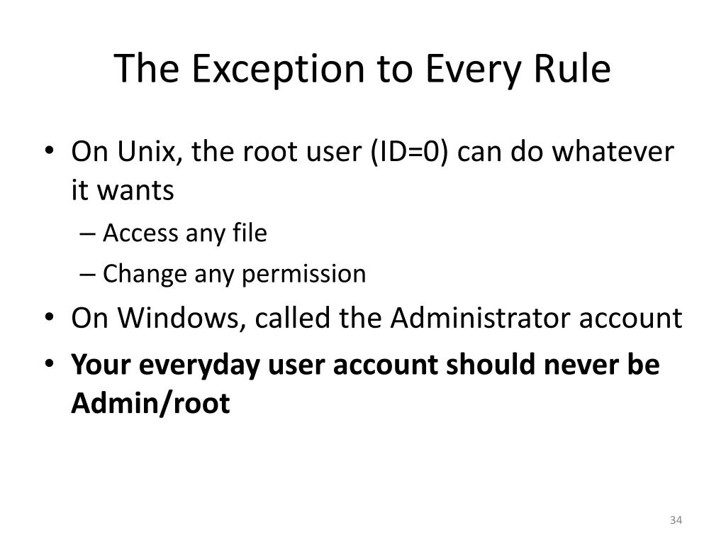 The Exception to Every Rule • On Unix, the root user (ID=0) can do whatever it wants • Access any file • Change any permission • On Windows, called the Administrator account • Your everyday user account should never be Admin/root