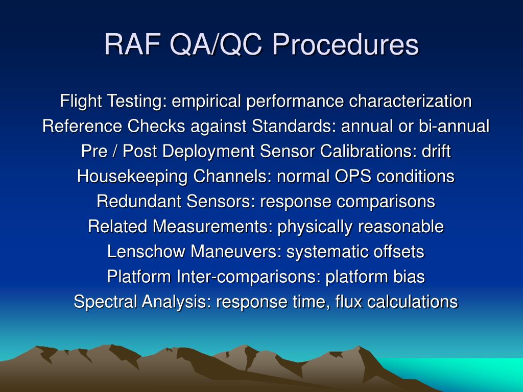 RAF QA/QC Procedures Flight Testing: empirical performance characterization Reference Checks against Standards: annual or bi-annual Pre / Post Deployment Sensor Calibrations: drift Housekeeping Channels: normal OPS conditions Redundant Sensors: response comparisons Related Measurements: physically reasonable Lenschow Maneuvers: systematic offsets Platform Inter-comparisons: platform bias Spectral Analysis: response time, flux calculations