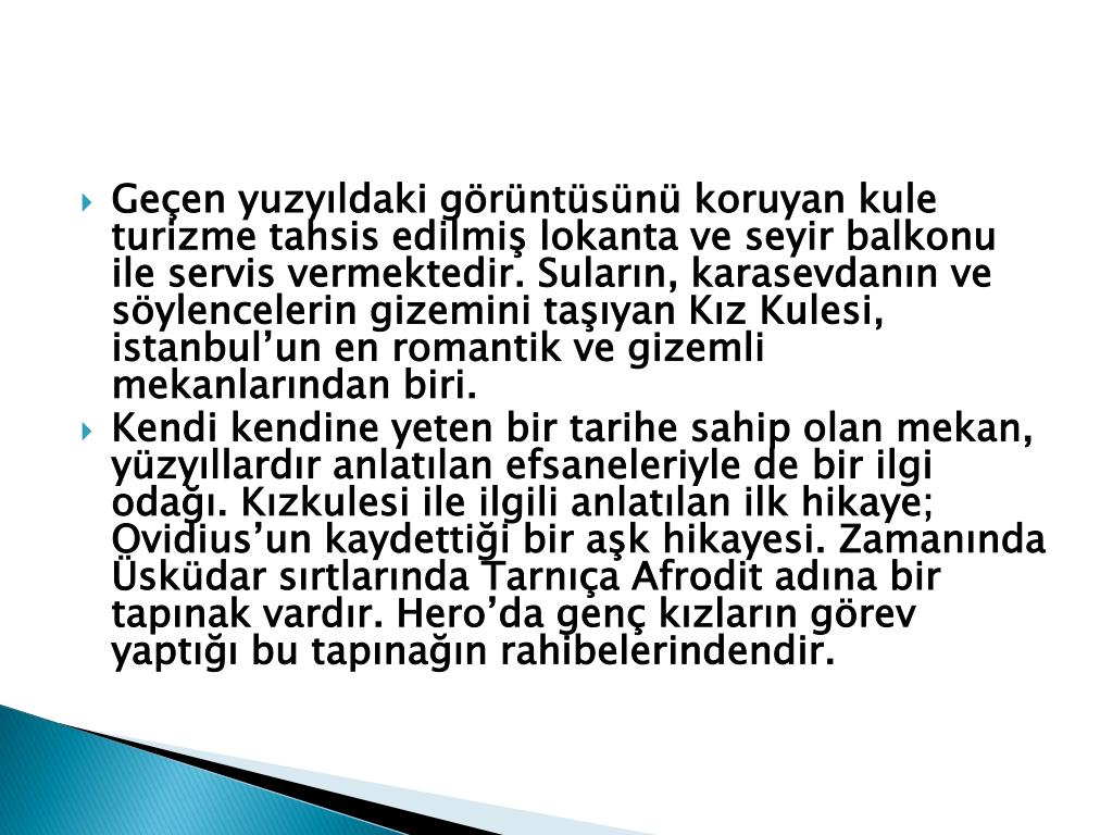 Geçen yuzyıldaki görüntüsünü koruyan kule turizme tahsis edilmiş lokanta ve seyir balkonu ile servis vermektedir. Suların, karasevdanın ve söylencelerin gizemini taşıyan Kız Kulesi, istanbul’un en romantik ve gizemli mekanlarından biri. • Kendi kendine yeten bir tarihe sahip olan mekan, yüzyıllardır anlatılan efsaneleriyle de bir ilgi odağı. Kızkulesi ile ilgili anlatılan ilk hikaye; Ovidius’un kaydettiği bir aşk hikayesi. Zamanında Üsküdar sırtlarında Tarnıça Afrodit adına bir tapınak vardır. Hero’da genç kızların görev yaptığı bu tapınağın rahibelerindendir.