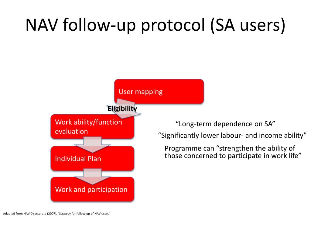 NAV follow-up protocol (SA users) User mapping Eligibility Work ability/function evaluation “Long-term dependence on SA” “Significantly lower labour- and income ability” Programme can “strengthen the ability of those concerned to participate in work life” Individual Plan Work and participation Adapted from NAV Directorate (2007), “Strategy for follow-up of NAV users”