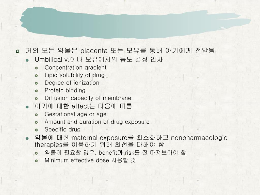 거의 모든 약물은 placenta 또는 모유를 통해 아기에게 전달됨 • Umbilical v.이나 모유에서의 농도 결정 인자 • Concentration gradient • Lipid solubility of drug • Degree of ionization • Protein binding • Diffusion capacity of membrane • 아기에 대한 effect는 다음에 따름 • Gestational age or age • Amount and duration of drug exposure • Specific drug • 약물에 대한 maternal exposure를 최소화하고 nonpharmacologic therapies를 이용하기 위해 최선을 다해야 함 • 약물이 필요할 경우, benefit과 risk를 잘 따져보아야 함 • Minimum effective dose 사용할 것