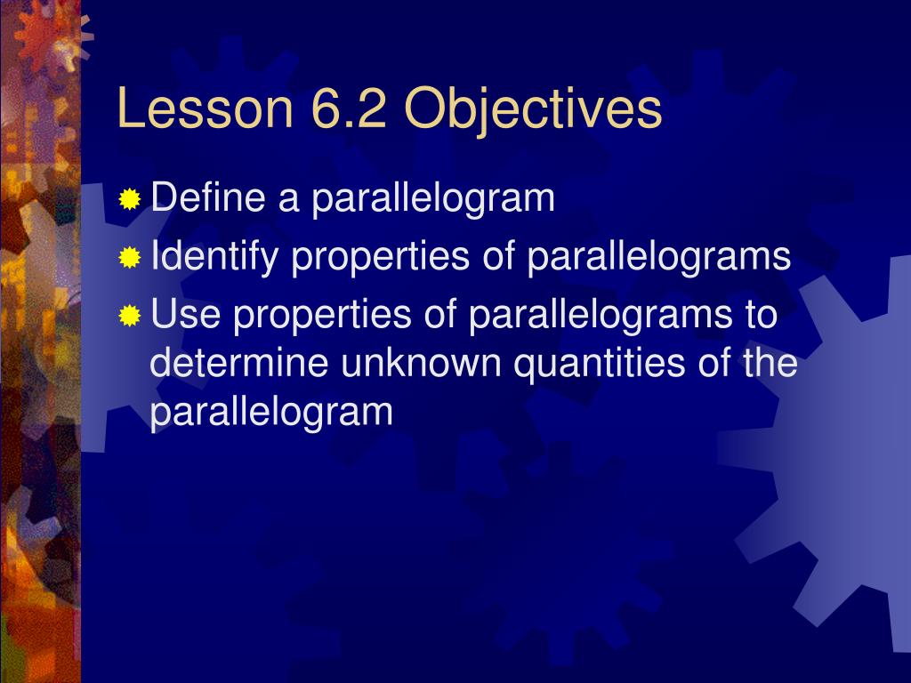 Lesson 6.2 Objectives • Define a parallelogram • Identify properties of parallelograms • Use properties of parallelograms to determine unknown quantities of the parallelogram