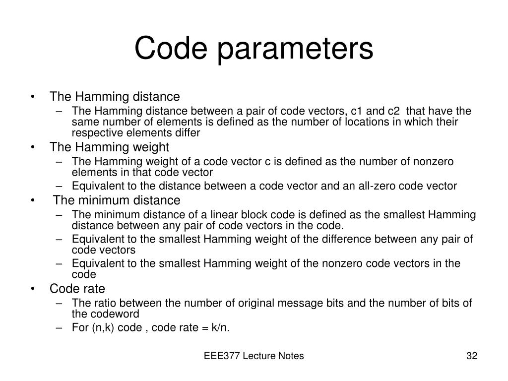 Code parameters • The Hamming distance • The Hamming distance between a pair of code vectors, c1 and c2 that have the same number of elements is defined as the number of locations in which their respective elements differ • The Hamming weight • The Hamming weight of a code vector c is defined as the number of nonzero elements in that code vector • Equivalent to the distance between a code vector and an all-zero code vector • The minimum distance • The minimum distance of a linear block code is defined as the smallest Hamming distance between any pair of code vectors in the code. • Equivalent to the smallest Hamming weight of the difference between any pair of code vectors • Equivalent to the smallest Hamming weight of the nonzero code vectors in the code • Code rate • The ratio between the number of original message bits and the number of bits of the codeword • For (n,k) code , code rate = k/n. EEE377 Lecture Notes