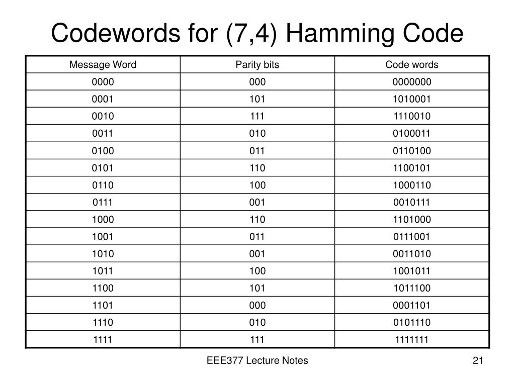 Codewords for (7,4) Hamming Code EEE377 Lecture Notes