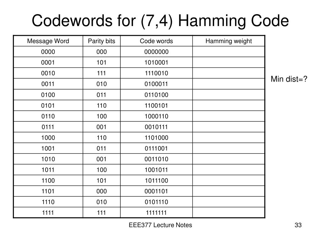Codewords for (7,4) Hamming Code Min dist=? EEE377 Lecture Notes