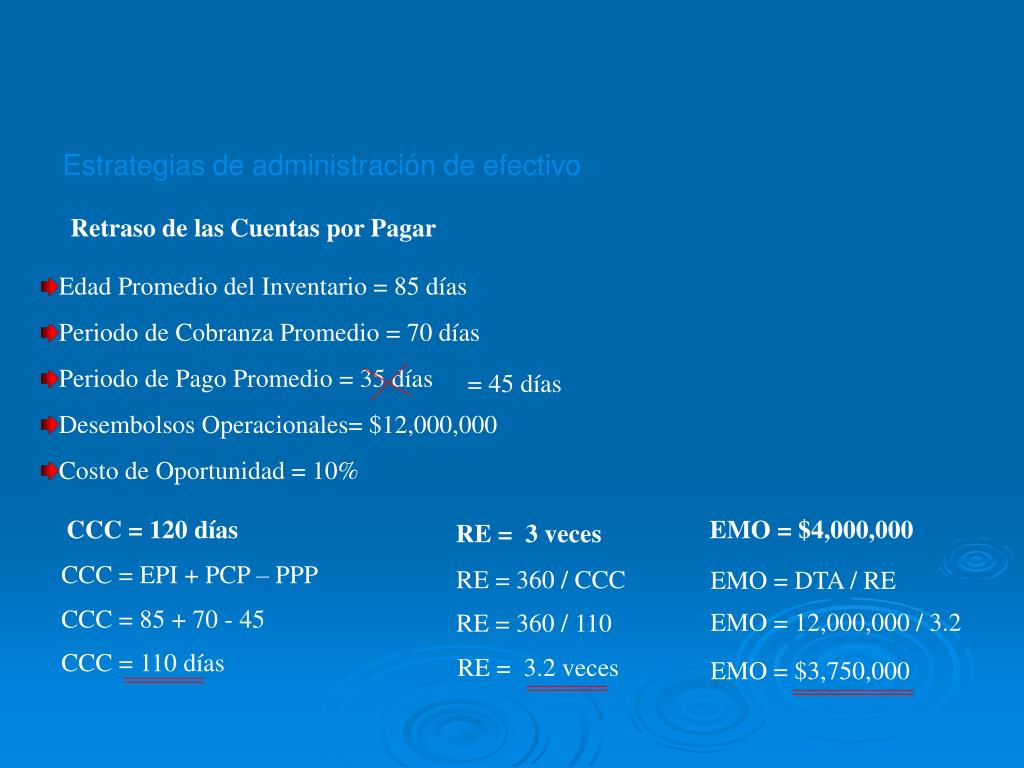 Estrategias de administración de efectivo Retraso de las Cuentas por Pagar • Edad Promedio del Inventario = 85 días • Periodo de Cobranza Promedio = 70 días • Periodo de Pago Promedio = 35 días • Desembolsos Operacionales= $12,000,000 • Costo de Oportunidad = 10% = 45 días CCC = 120 días EMO = $4,000,000 RE = 3 veces CCC = EPI + PCP – PPP RE = 360 / CCC EMO = DTA / RE CCC = 85 + 70 - 45 EMO = 12,000,000 / 3.2 RE = 360 / 110 CCC = 110 días RE = 3.2 veces EMO = $3,750,000