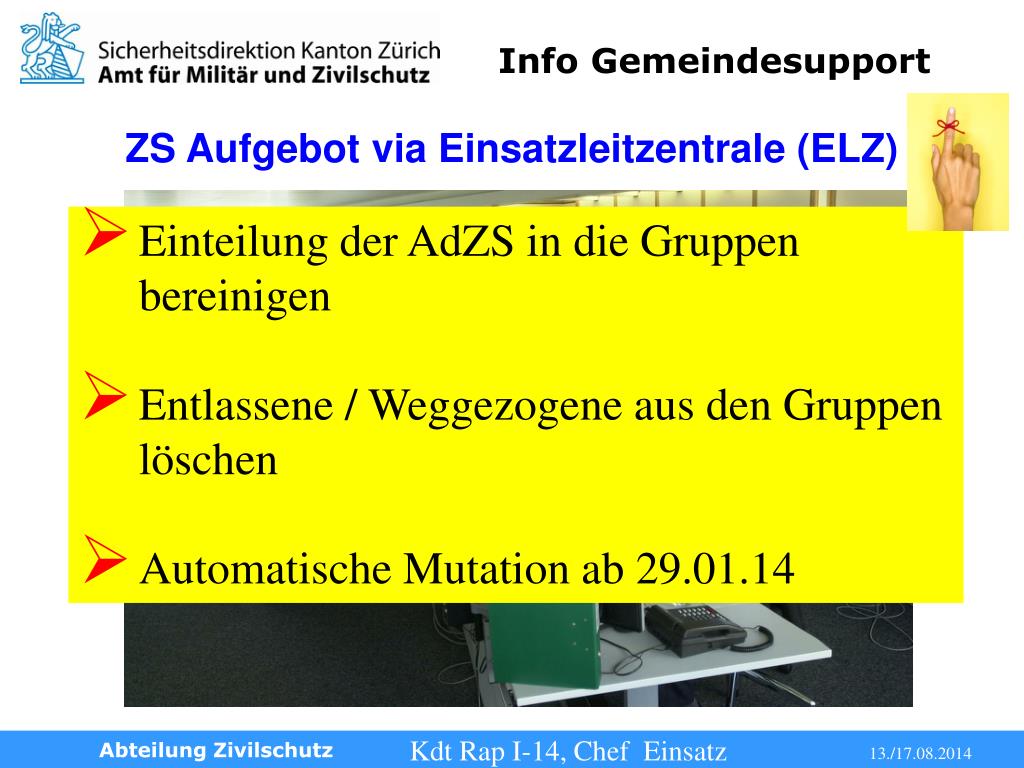 ZS Aufgebot via Einsatzleitzentrale (ELZ) • Einteilung der AdZS in die Gruppen bereinigen • Entlassene / Weggezogene aus den Gruppen löschen • Automatische Mutation ab 29.01.14 Abteilung Zivilschutz