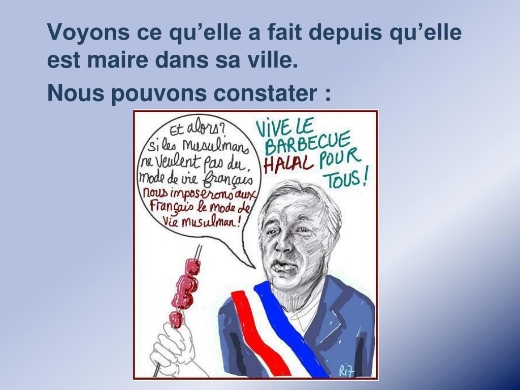 - Une demande de différenciation de la nourriture dans les cantines scolaires, - Un nombre important d'employés musulmans à la mairie de Lille, - Une piscine réservée aux musulmanes, - Des écoles islamiques et coraniques, - Des banques musulmanes, -Des cinémas, - Des restaurants, - Des salles de spectacles séparées pour chaque sexe. Et Aussi…