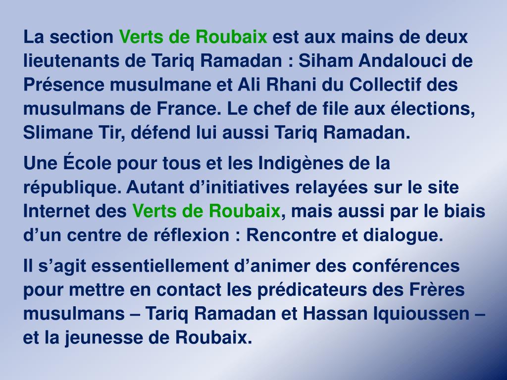 La section Verts de Roubaix est aux mains de deux lieutenants de Tariq Ramadan : Siham Andalouci de Présence musulmane et Ali Rhani du Collectif des musulmans de France. Le chef de file aux élections, Slimane Tir, défend lui aussi Tariq Ramadan. Une École pour tous et les Indigènes de la république. Autant d’initiatives relayées sur le site Internet des Verts de Roubaix, mais aussi par le biais d’un centre de réflexion : Rencontre et dialogue. Il s’agit essentiellement d’animer des conférences pour mettre en contact les prédicateurs des Frères musulmans – Tariq Ramadan et Hassan Iquioussen – et la jeunesse de Roubaix.