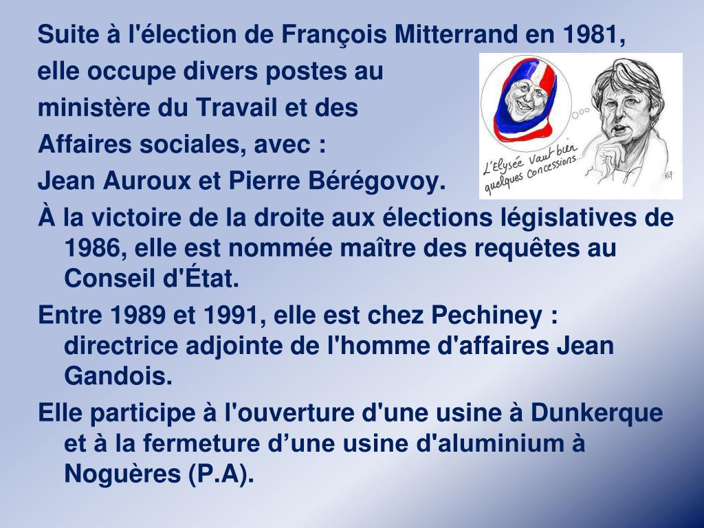 Suite à l'élection de François Mitterrand en 1981, elle occupe divers postes au ministère du Travail et des Affaires sociales, avec : Jean Auroux et Pierre Bérégovoy. À la victoire de la droite aux élections législatives de 1986, elle est nommée maître des requêtes au Conseil d'État. Entre 1989 et 1991, elle est chez Pechiney : directrice adjointe de l'homme d'affaires Jean Gandois. Elle participe à l'ouverture d'une usine à Dunkerque et à la fermeture d’une usine d'aluminium à Noguères (P.A).