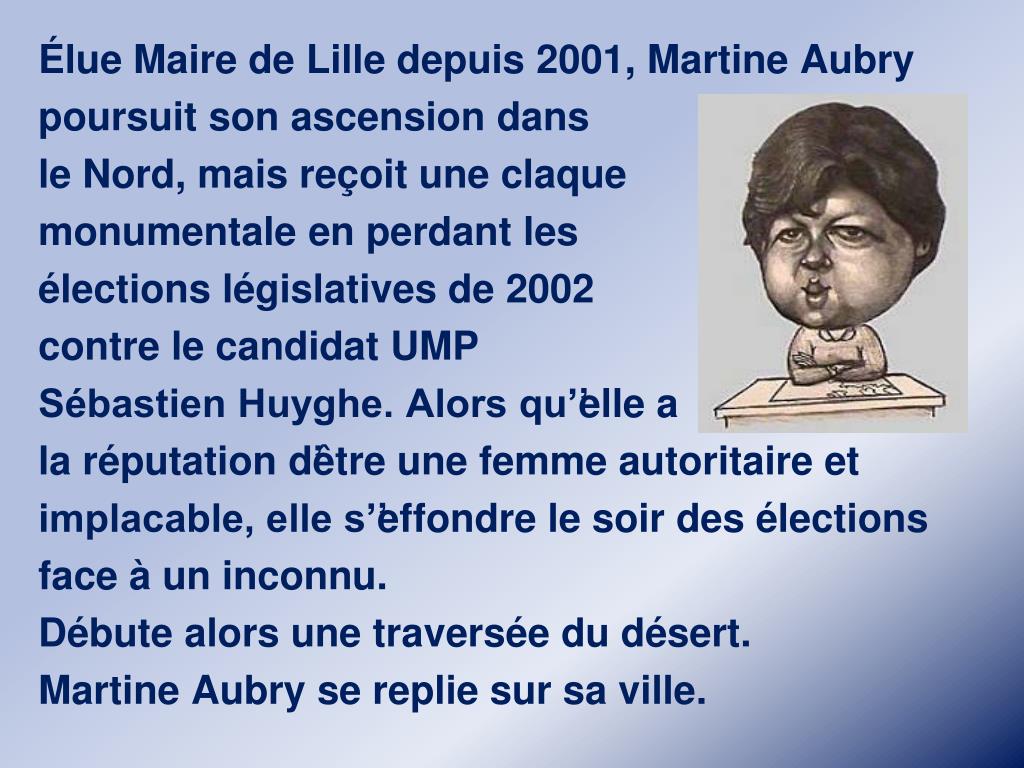 Élue Maire de Lille depuis 2001, Martine Aubry poursuit son ascension dans le Nord, mais reçoit une claque monumentale en perdant les élections législatives de 2002 contre le candidat UMP Sébastien Huyghe. Alors qu’elle a la réputation dêtre une femme autoritaire et implacable, elle s’effondre le soir des élections face à un inconnu. Débute alors une traversée du désert. Martine Aubry se replie sur sa ville.