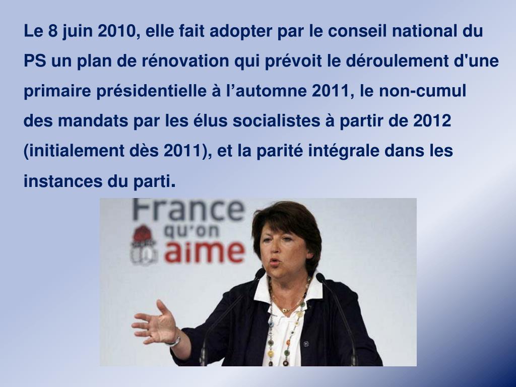 Le 8 juin 2010, elle fait adopter par le conseil national du PS un plan de rénovation qui prévoit le déroulement d'une primaire présidentielle à l’automne 2011, le non-cumul des mandats par les élus socialistes à partir de 2012 (initialement dès 2011), et la parité intégrale dans les instances du parti.