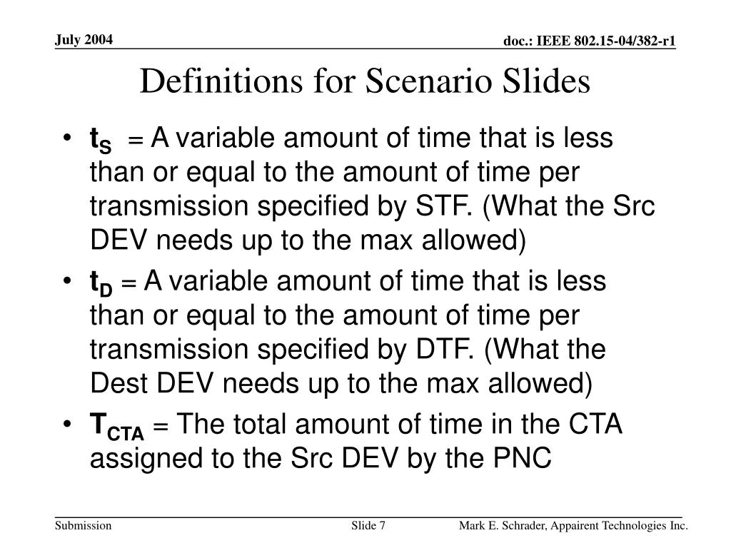 Definitions for Scenario Slides • tS = A variable amount of time that is less than or equal to the amount of time per transmission specified by STF. (What the Src DEV needs up to the max allowed) • tD = A variable amount of time that is less than or equal to the amount of time per transmission specified by DTF. (What the Dest DEV needs up to the max allowed) • TCTA = The total amount of time in the CTA assigned to the Src DEV by the PNC Mark E. Schrader, Appairent Technologies Inc.