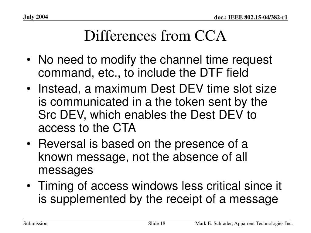 Differences from CCA • No need to modify the channel time request command, etc., to include the DTF field • Instead, a maximum Dest DEV time slot size is communicated in a the token sent by the Src DEV, which enables the Dest DEV to access to the CTA • Reversal is based on the presence of a known message, not the absence of all messages • Timing of access windows less critical since it is supplemented by the receipt of a message Mark E. Schrader, Appairent Technologies Inc.